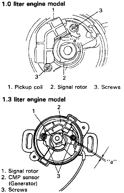 3. If gap is out of specification, loose CMP sensor (signal generator) securing screws. Using blade (-) screw driver, move CMP sensor (generator) and adjust gap to specification. After adjustment, tighten securing screws and recheck gap.