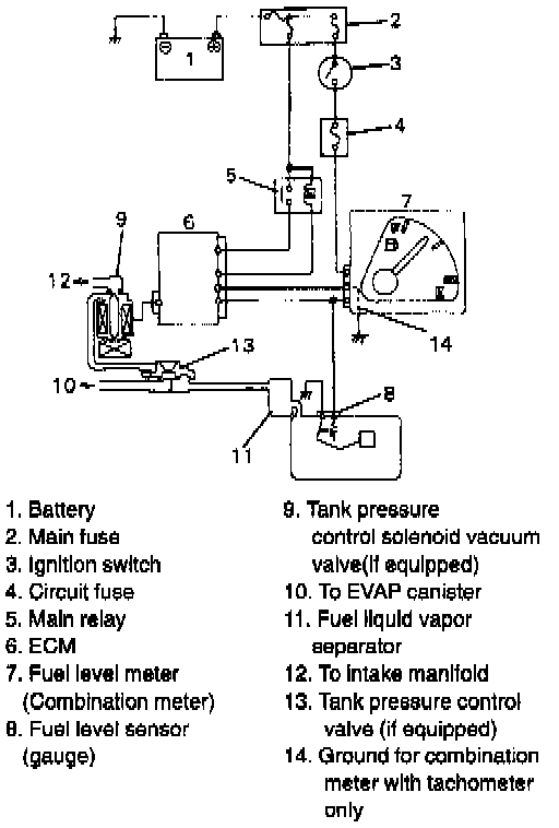 This signal is sent from the fuel level sensor (gauge) installed in the fuel tank. ECM uses this signal as one of the monitoring conditions for detecting diagnostic trouble code (DTC). For vehicle with tank pressure control solenoid vacuum valve, ECM also uses this signal to control tank pressure control solenoid vacuum valve.