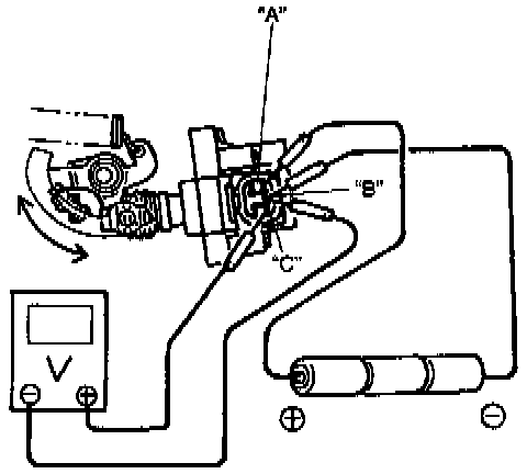 - Disconnect connector from ISC actuator.- Arrange 3 new 1.5V batteries in series (4.5V in total) and connect these batteries to CTP switch terminals "A" and "B".
