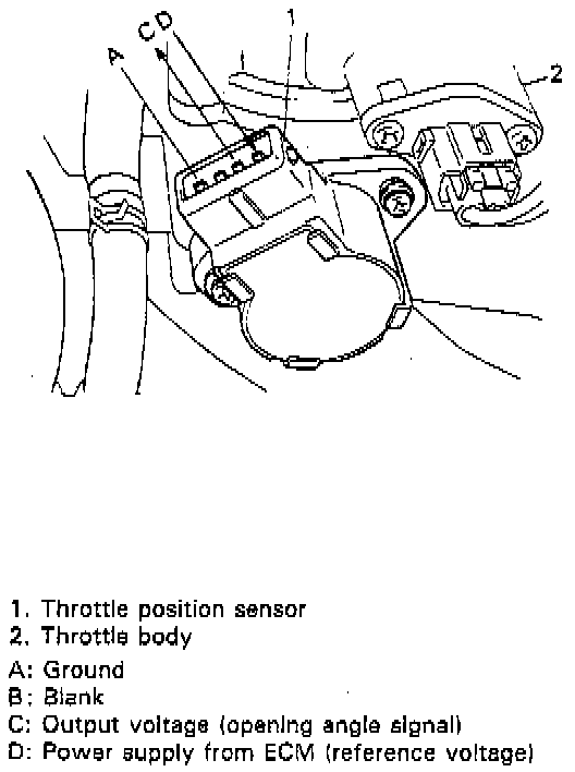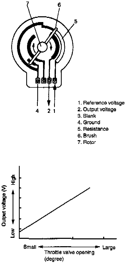 The throttle position sensor is connected to the throttle valve shaft on the throttle body, and detects the throttle valve opening. The throttle opening is detected by the potentiometer as follows. A 5-volt reference voltage is applied to the sensor from ECM and as its brush moves over the print resistance according to the throttle valve opening, the output voltage varies accordingly. By monitoring sensor output voltage, ECM detects the throttle valve opening. ECM uses the signal from TP sensor as one of the signals to control fuel injector, ISC actuator, EGR solenoid vacuum valve and automatic transmission.