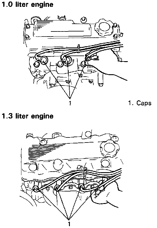 2. Disconnect high-tension cords at spark plugs. To avoid inside damage of cords, DO NOT pull on cords for disconnection. Pull on caps.