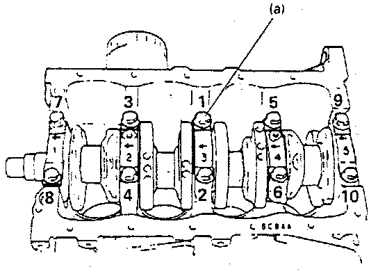 After installing bearing cap stiffeners, tighten bearing cap bolts in such order as shown in figure a little at a time and repeat it till they are tightened to specified torque.