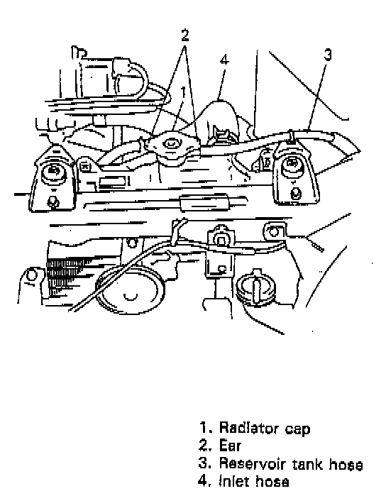 NOTE: After installing radiator cap to radiator, make sure that its ear is aligned with reservoir tank hose as shown in figure. If not, turn cap more to align its ear with hose.