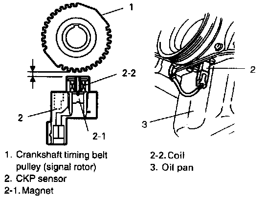 The sensor consists of magnet and coil. It is mounted on oil pan with specified air gap between the sensor core end and crankshaft timing belt pulley tooth.
