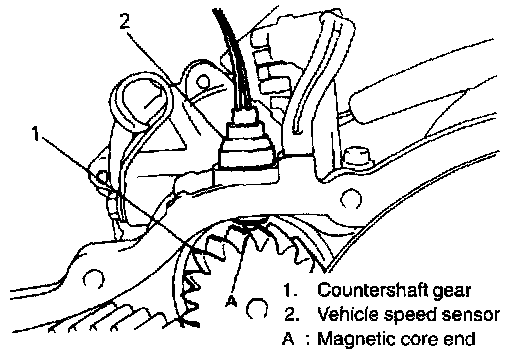 The vehicle speed sensor consists of a magnetic core with magnet and coil. It is mounted on transmission case with O.6mm (0.024 in.) air gap between the core end and countershaft gear tooth.
