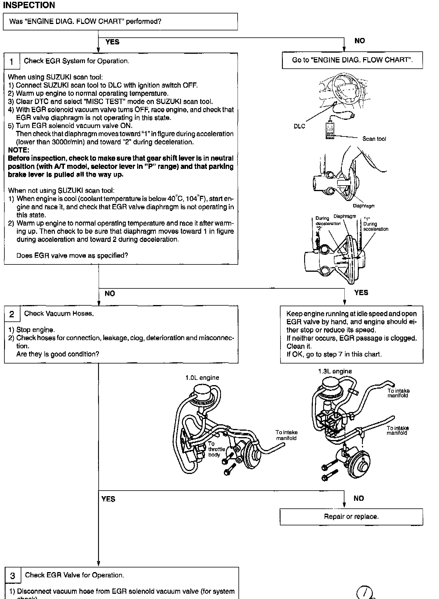 - Check EGR system referring to step 1 of DTC P0400 Flow Chart, shown above. If EGR valve fails to operator properly, check vacuum hoses, EGR valve, EGR pressure transducer, EGR solenoid vacuum valve, EGR solenoid vacuum valve for system check and electrical circuits.