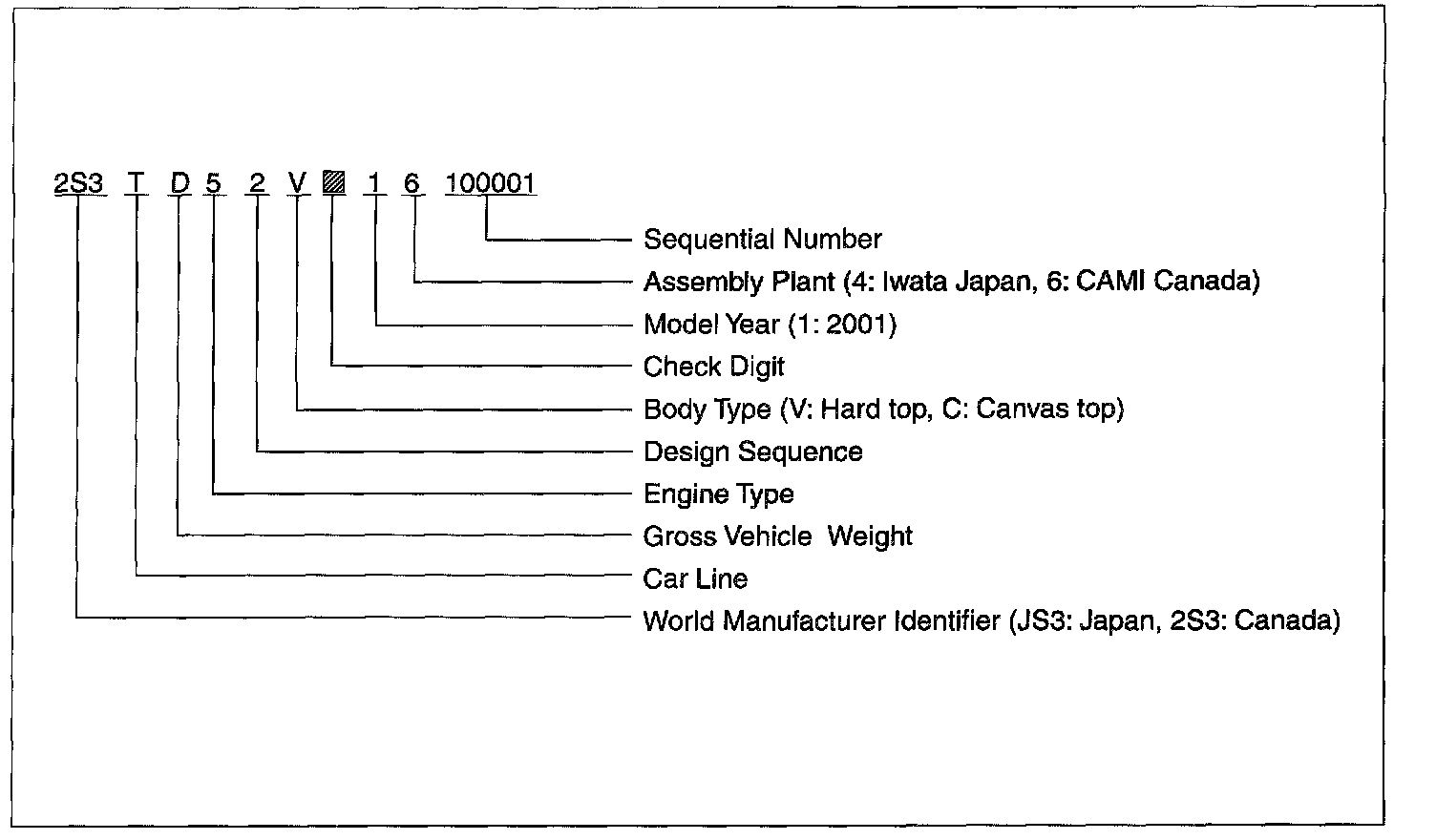 The vehicle identification number is on the left side of instrument panel. Refer to the figure for detailed VIN cord information and its location.