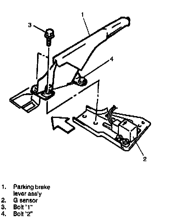 3. Remove parking brake lever bolts "1" and G sensor with bracket from floor.