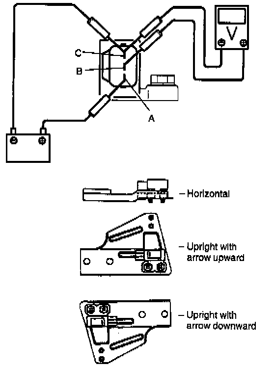2. Connect positive cable of 12 volt battery to "A" terminal of sensor and ground cable to "C" terminal. Then using voltmeter, check voltage between "B" terminal and "C" terminal.