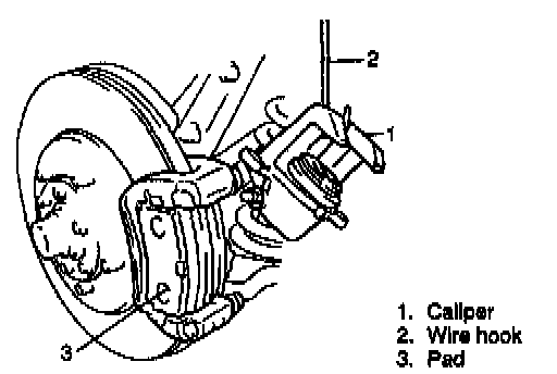 NOTE: Hang removed caliper with a wire hook or the like so as to prevent brake hose from bending and twisting excessively or being pulled. Don't operate brake pedal with pads removed.