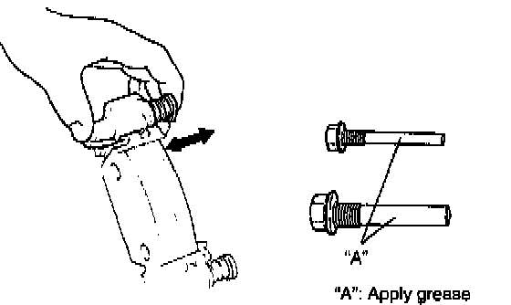 Check slide pin bolt for smooth movement as shown. If it is found faulty, correct or replace. Apply rubber grease to slide pin bolt outer surface. Rubber grease should be the on whose viscosity is less affected by such low temperature a -40°C (-40°F).