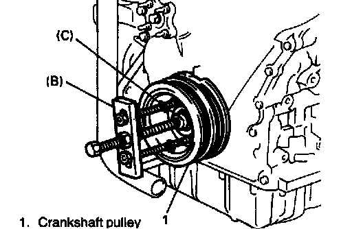 15. Remove crankshaft pulley. If it is hard to remove, use special tools (Steering wheel remover, Bearing puller attachment) as shown in figure. If bolts of steering wheel remover are too long, replace them with those of suitable length.