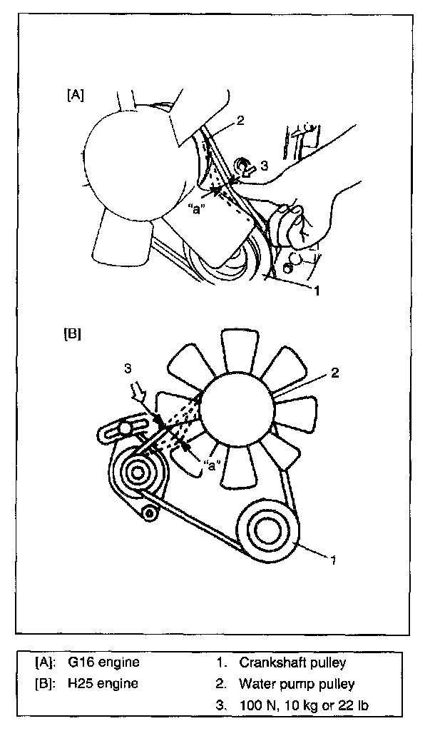 NOTE: When replacing belt with a new one, adjust belt tension to 5 - 6 mm (0.20 - 0.24 in.) for G16 engine, 7 - 9 mm (0.28 - 0.35 in.) for H25 engine.