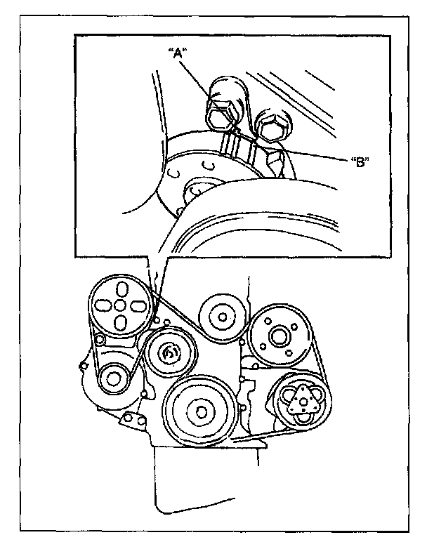 Tension indicator "B" should be the right of indicator "A" as shown in the figure. If indicator "B" is found to the left of indicator "A", replace generator belt.