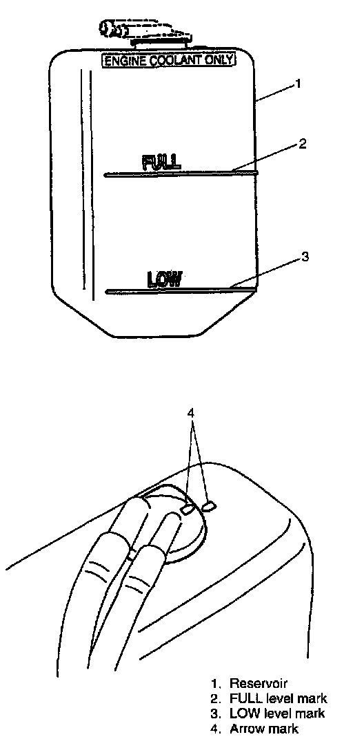 If coolant level is below "LOW" mark, remove reservoir cap and add proper coolant to reservoir to bring coolant level up to "FULL" mark. Then, reinstall cap.