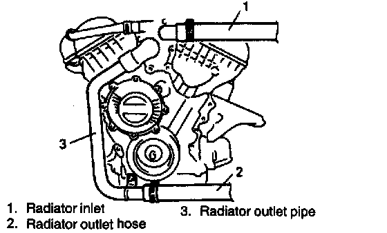 3. Remove radiator inlet, outlet hoses and radiator outlet pipe.