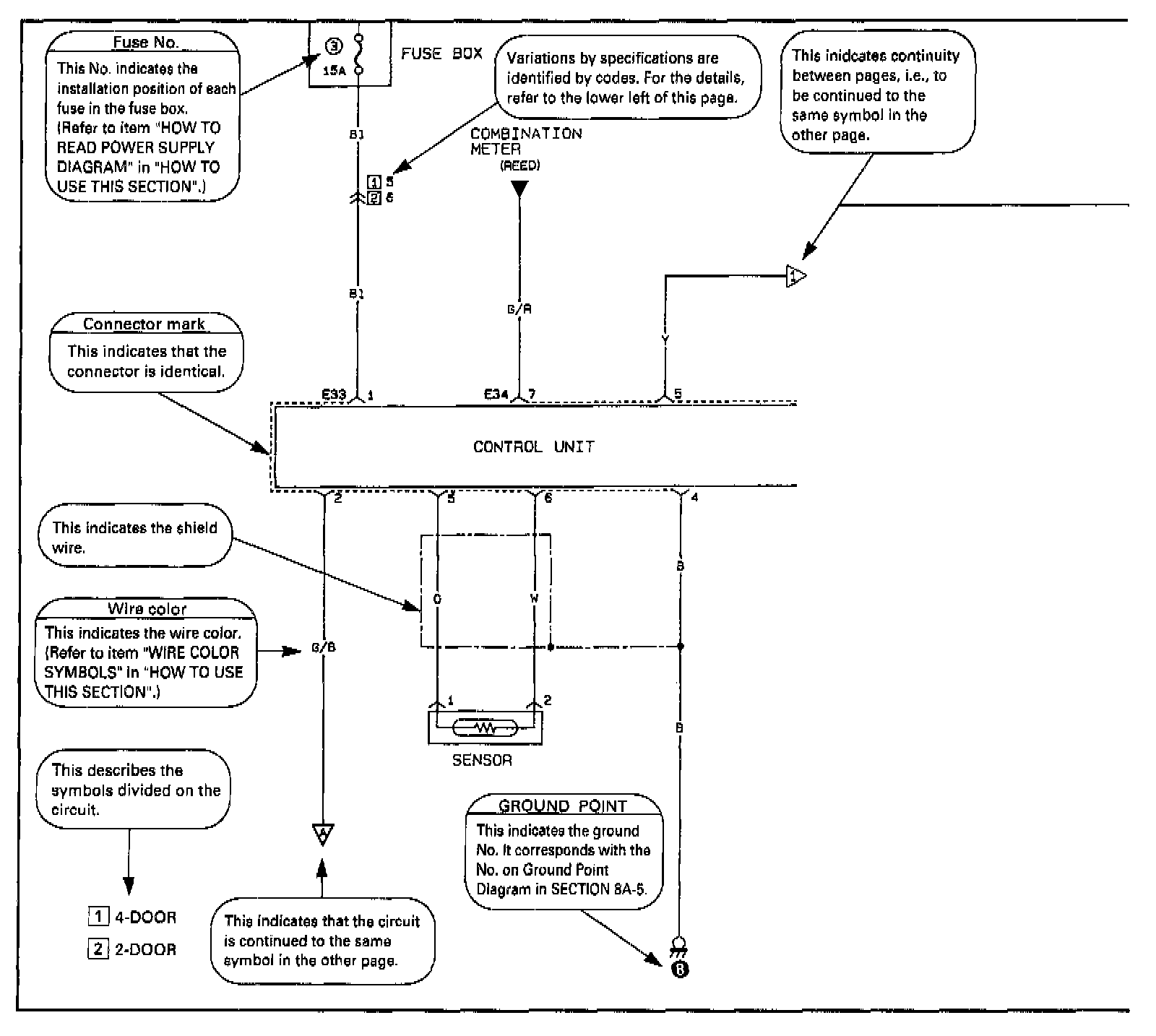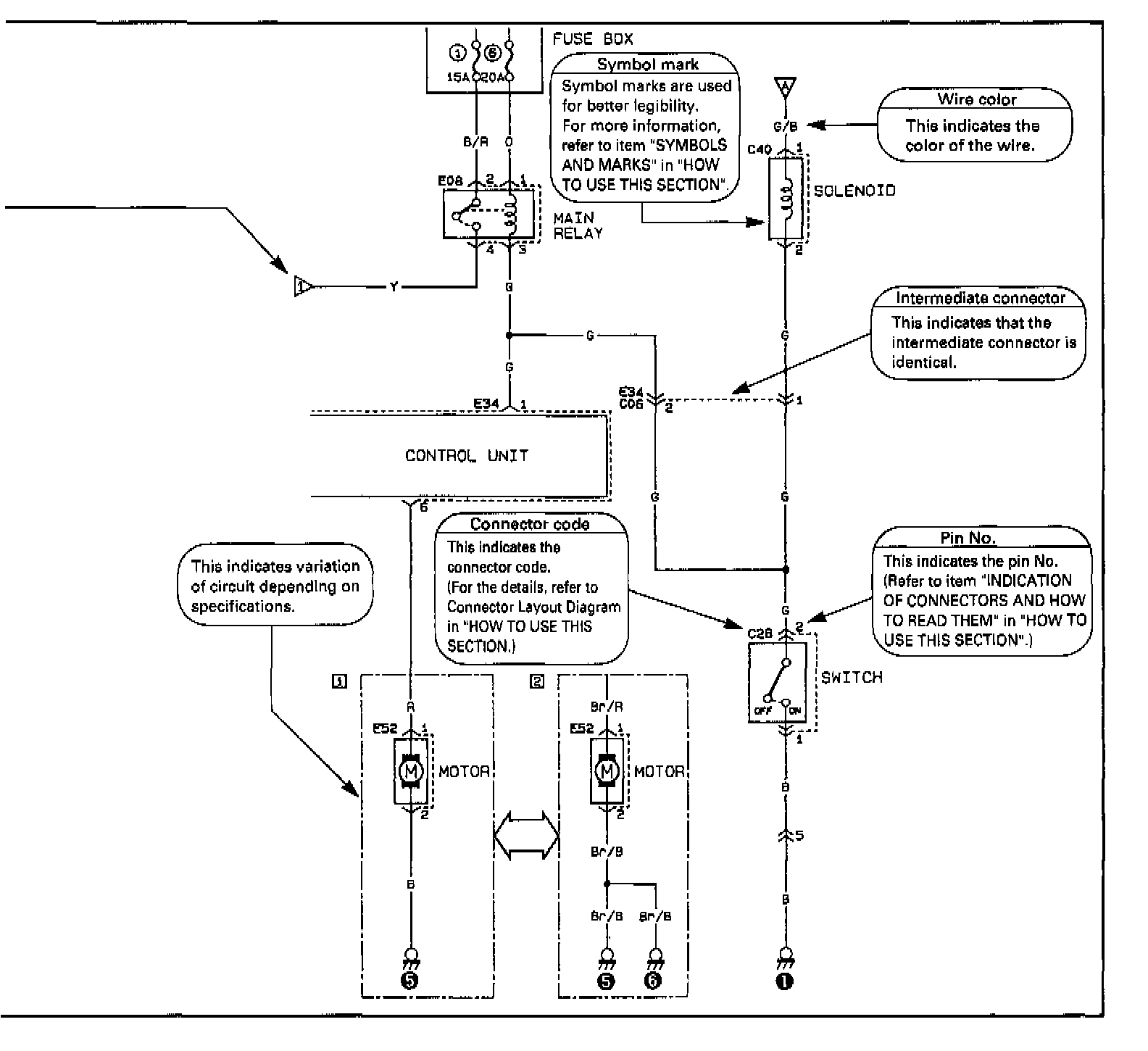 The circuit diagram of each system shows the electric circuit from the main fuse , fuse box or the ignition switch (at the top in the diagram) to the ground (at the bottom) so that the circuit can be followed easily when performing inspection and service work. For utilization of this diagram together with Connector Layout Diagram or List of Connectors (shape of connector/pin arrangement), refer to item "INDICATION OF CONNECTORS AND HOW TO READ THEM" in "HOW TO USE THIS SECTION".