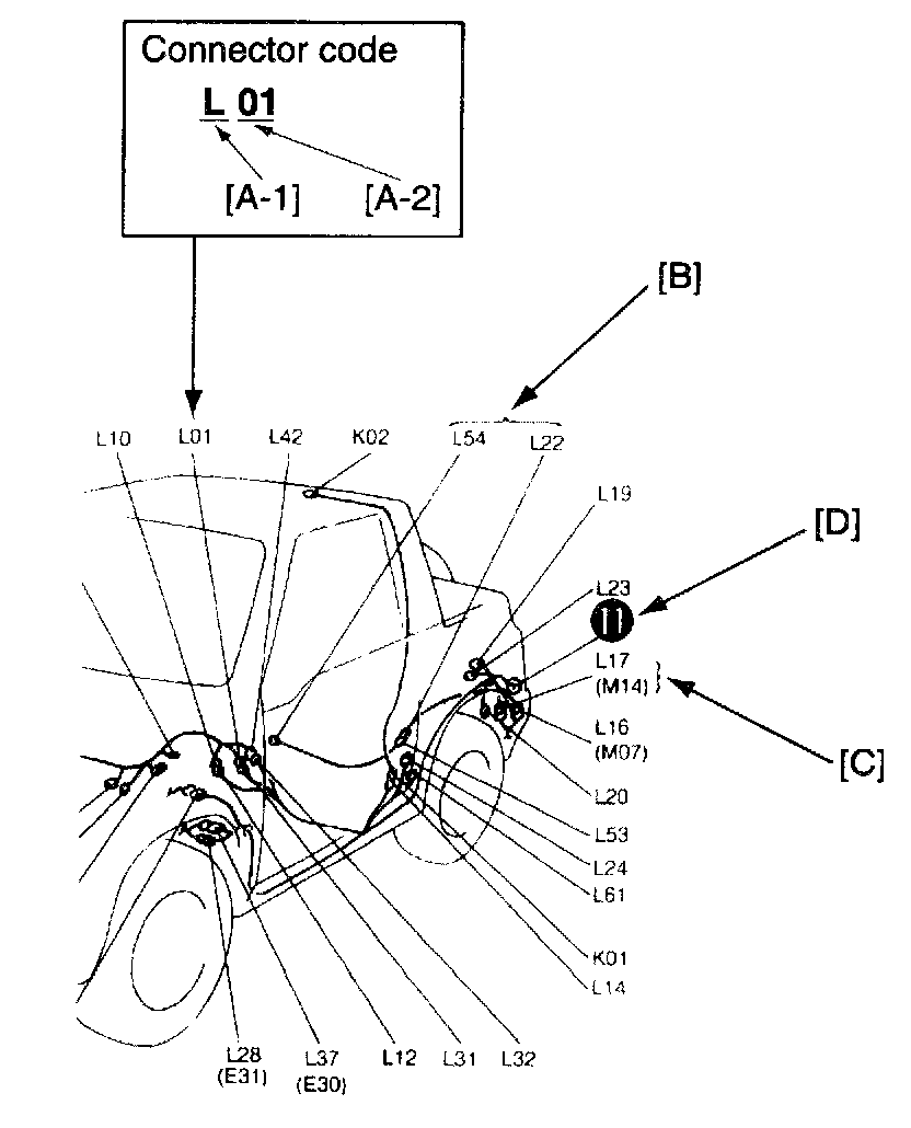 First consult ("SYSTEM CIRCUIT DIAGRAM") or connector table for the connector code of interest. Second refer to the diagrams and look for the same code. More information on use of the code is illustrated below.