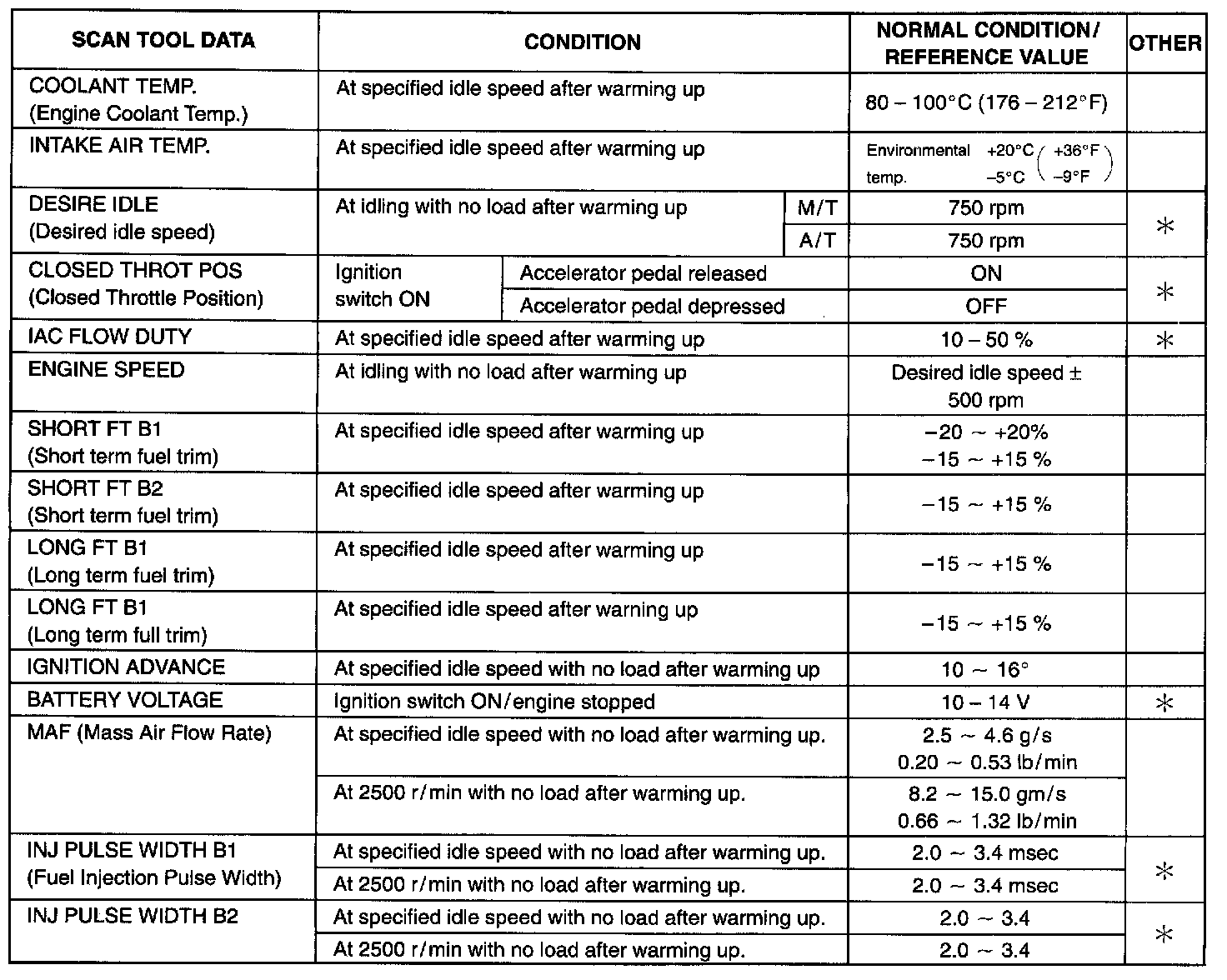 Also, conditions in the below table that can be checked by the scan tool are those output from ECM (PCM) as Commands and there may be cases where the engine or actuator is not operating (in the condition) as indicated by the scan tool. Be sure to use the timing light to check the ignition timing.