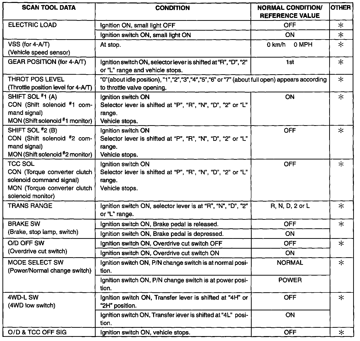 O/D & TCC OFF SIG (OVER DRIVE AND TORQUE CONVERTER CLUTCH OFF SIGNAL, ON/OFF)