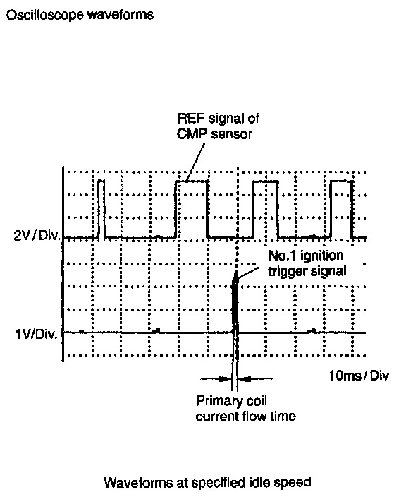 Oscilloscope waveforms of CMP sensor REF signal and No.1 ignition trigger signal are as shown in figure when connecting oscilloscope between terminal C51-3-1O of ECM (PCM) connector connected to ECM (PCM) and ground, and between terminal C51 -2-13 and ground.
