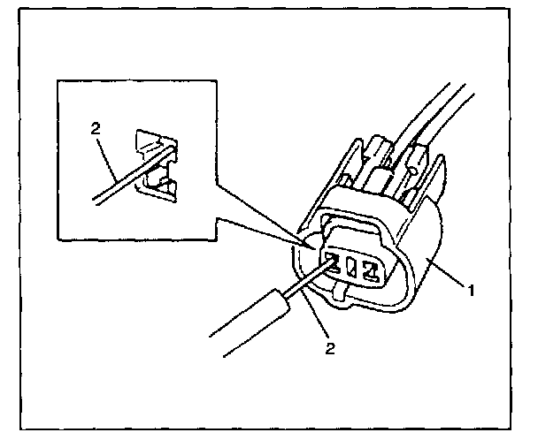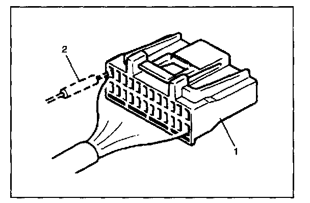 - When taking measurements at electrical connectors using a tester probe, be sure to insert the probe (2) from the wire harness side (backside) of the connector (1).