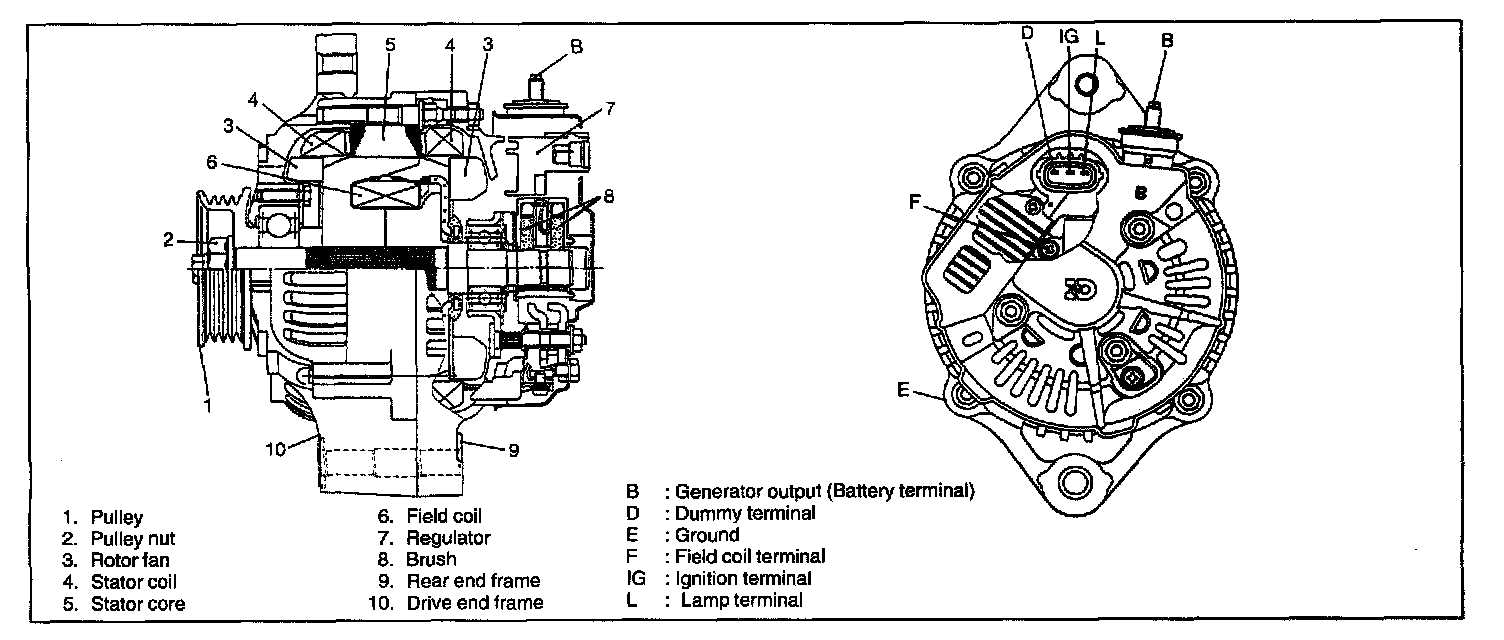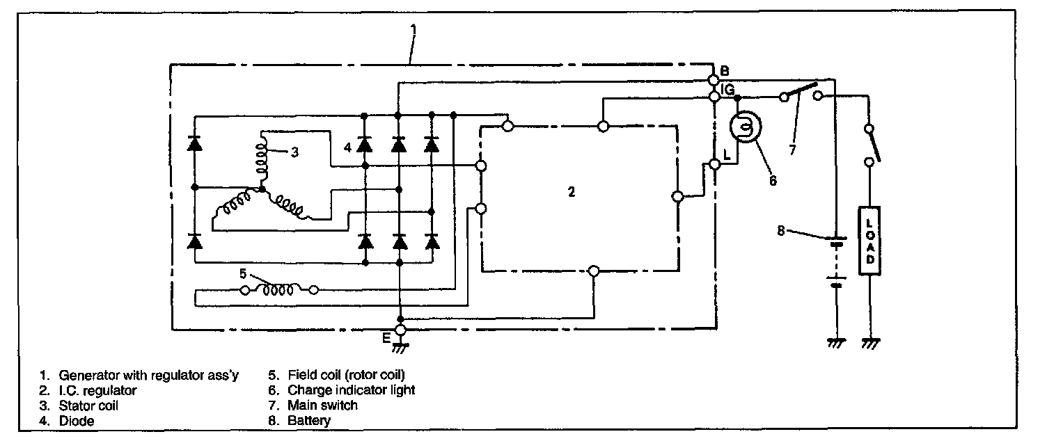 The generator is a small and high performance type with an IC regulator incorporated. The internal components are connected electrically as shown.The generator features are as follows: