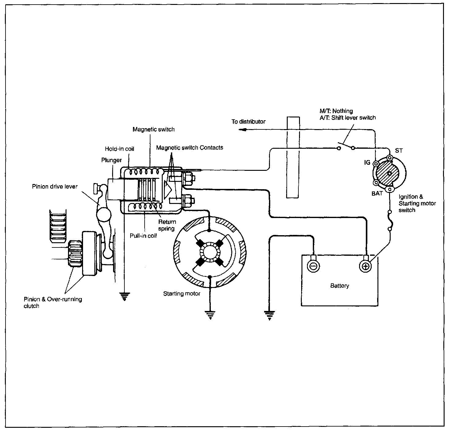 - The resulting plunger and pinion drive lever movement causes the pinion to engage the engine flywheel gear and the magnetic switch main contacts to close, and cranking takes place.