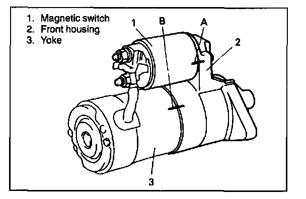 - Before disassembling starting motor, be sure to put match marks at two locations (A & B) left so that any possible mistake can be avoided.