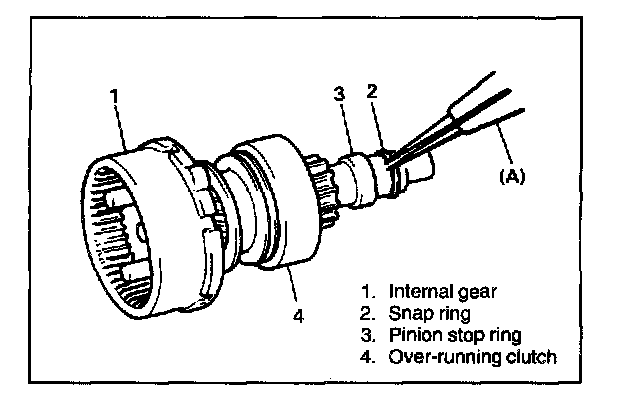 7. Remove snap ring, then pull out pin ion stop ring and over-run-fling clutch and internal gear.