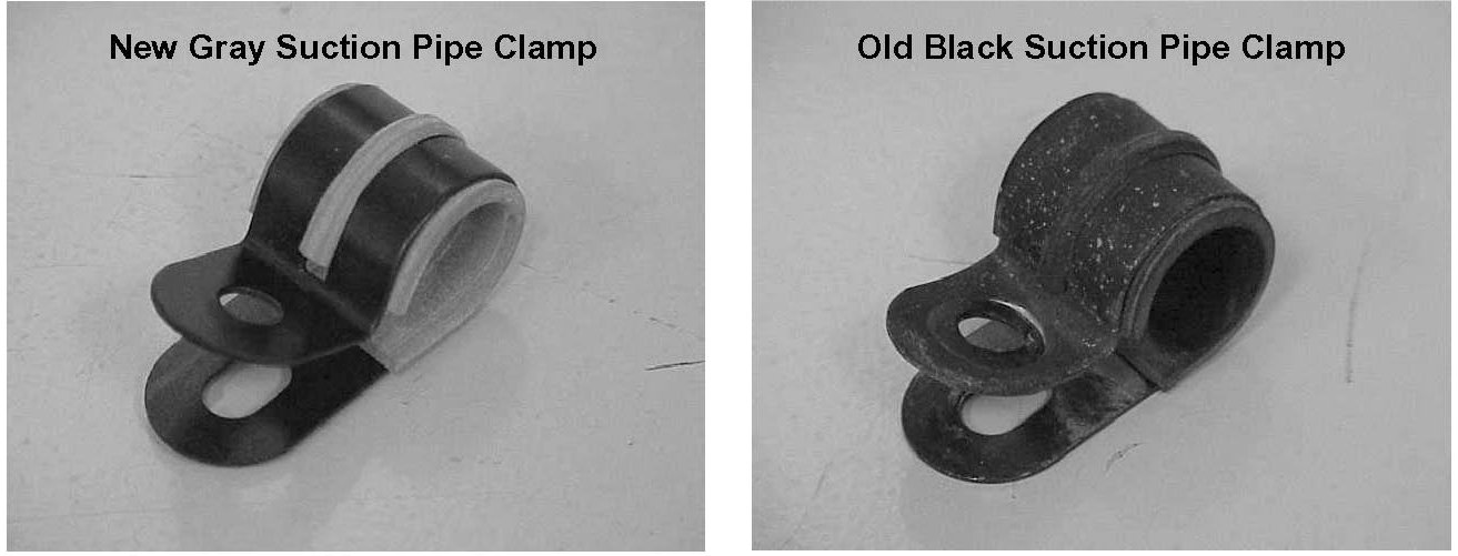Corrosion on suction pipe under clamps located on front of the radiator core support.