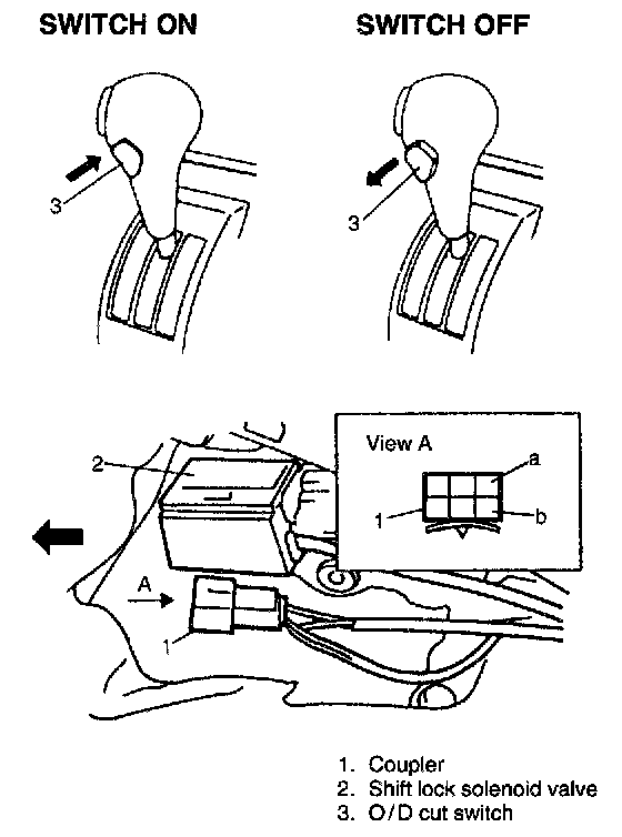 Remove front center console box and disconnect O/D cut switch coupler. Check its continuity between "a" and "b" terminals shown in figure.