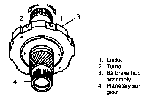 15. With B2 brake hub assembly held stationary, turn planetary sun gear clockwise to check that it locks and then counterclockwise to check that it turns smoothly.