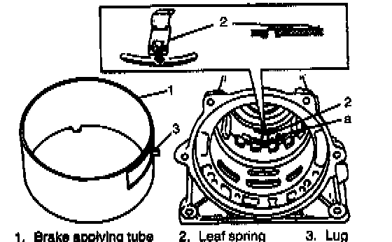 5. Install brake applying tube so that its lug fits in a in transmission case. After installation, check that 4 lugs along the underside of brake applying tube fit inside of reverse brake piston and leaf spring is installed properly.