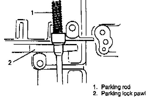 31. With parking lock rod installed to manual shift lever, place parking lock rod on parking lock pawl as shown in figure. Then install pawl bracket and tighten bracket screw to specified torque.