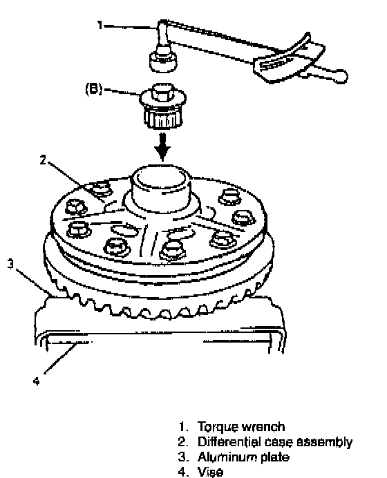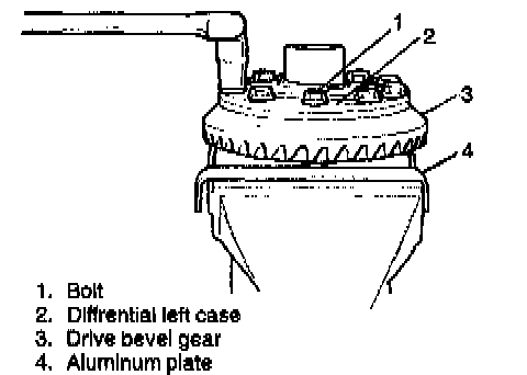 1. With aluminum plates placed on vise first, grip differential case with it and remove bevel gear by removing its bolts.