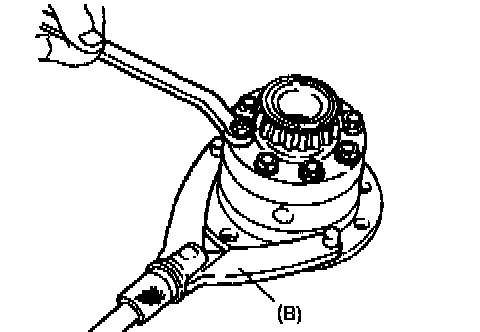 6. Install special tool (B) to differential case assembly and check that preload is within specification below. If preload exceeds specified value, check if foreign matter is caught or gear is damaged.