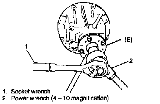 1. Hold universal joint flange with special tool (E) and then remove flange nut by using power wrench.