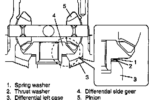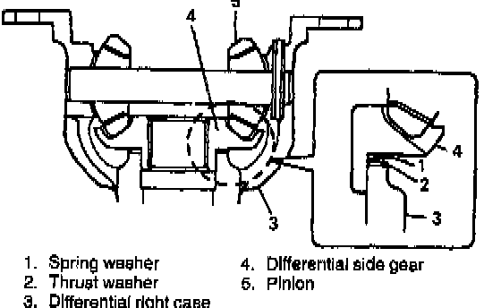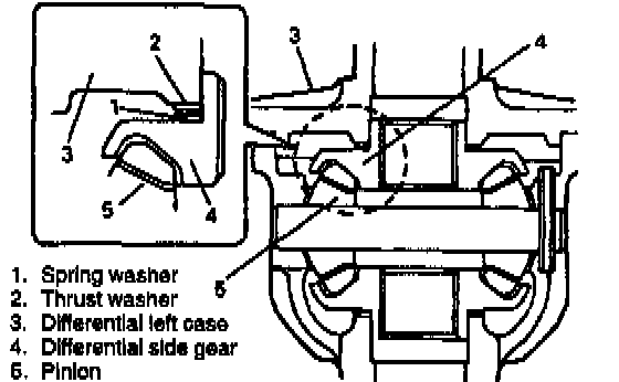 3. Remove pinion shaft, side gears, washers, differential pinions, spring washers, thrust washers.