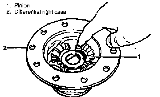 1. After applying differential oil to side gear, pinions, pinion shaft, thrust washer and spring washer, install them in differential right case. For correct installing direction of thrust washer and spring washer, refer to figure.
