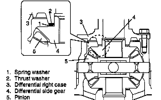 1. After applying differential oil to side gear, pinions, pinion shafts, washer, thrust washer and spring washer, install them in differential left case. For correct installing direction of thrust washer and spring washer, refer to figure.