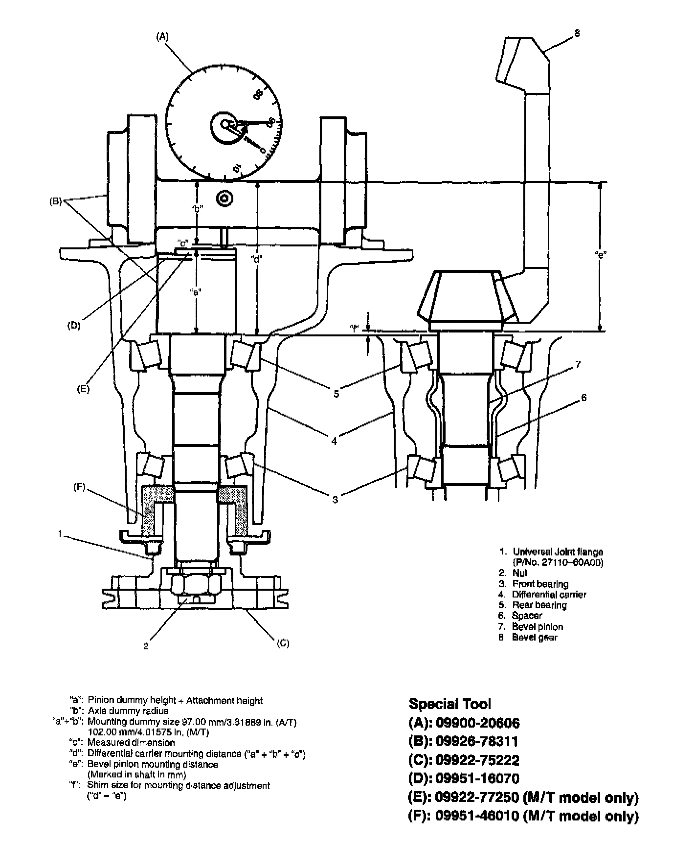 97 (A/T model) or 102 (M/T model) in above equation is "a" + "b" of mounting dummy (special tool (B)) as shown.