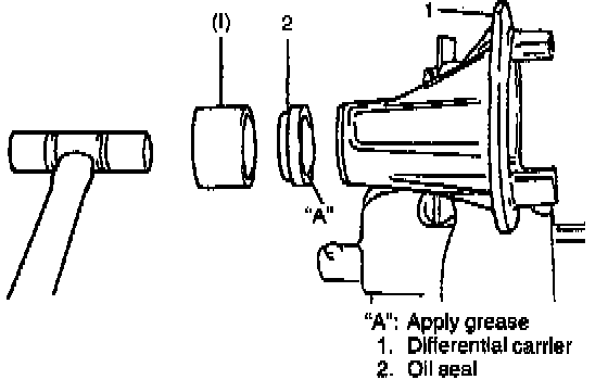8. Using special tool and plastic hammer, drive oil seal into differential carrier till it becomes flush with carrier end. Then apply grease to oil seal lip.