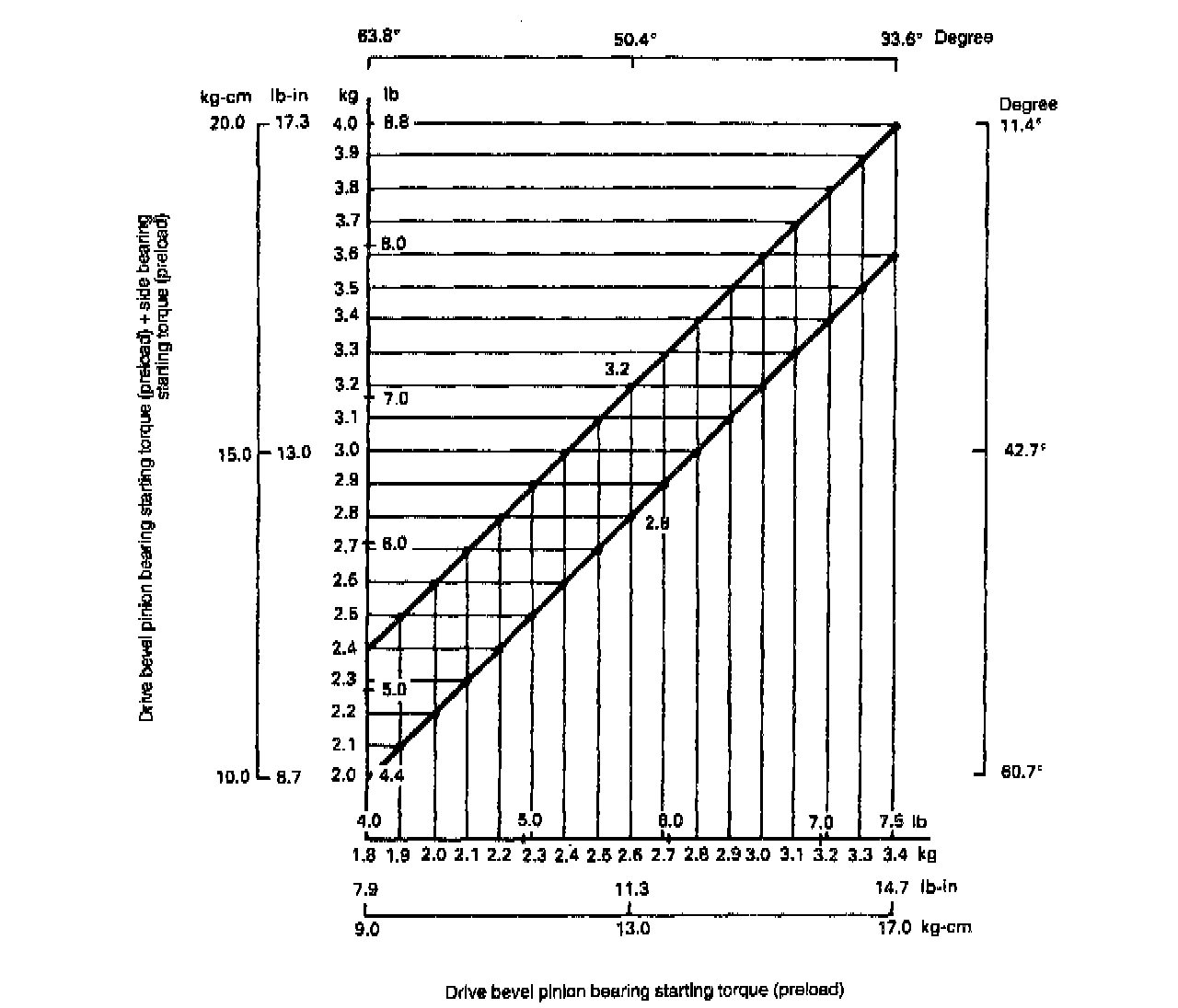 When preload of bevel pinion is 26 N (2.6 kg, 5.73 lbs.), acceptable composite preload of both pinion bearings and side bearings should be between 2.8 and 3.2 kg/6.17 and 7.05 lbs.
