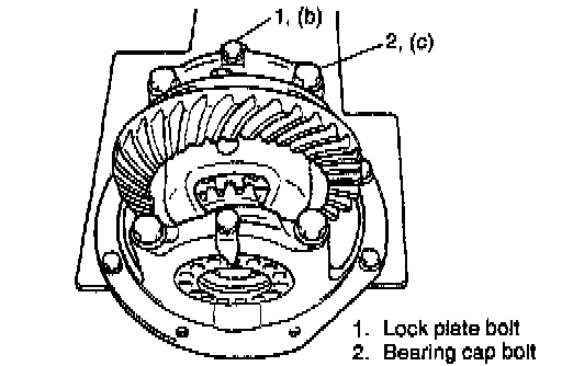 2. Take off differential side bearing lock plates and differential side bearing caps by removing their bolts and then take out bearing adjusters, side bearing outer races and drive bevel gear with differential case.
