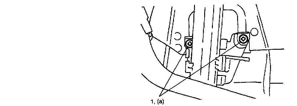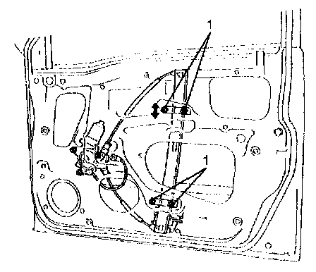 - When window becomes hard to raise and lower, adjust screws (1) to correct tilted glass as shown in the figure.