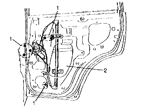 3. Remove door window regulator attaching nuts (6 pcs) (1), and take out regulator through hole (2) as shown in the figure.