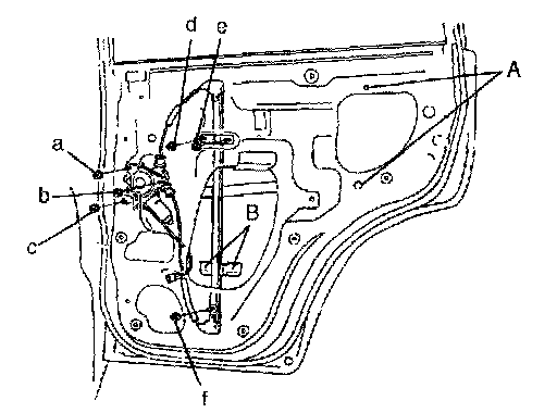 c. Tighten 3 regulator rail nuts according to the order (d, e, f) shown in the figure and 2 center sash bolts A.