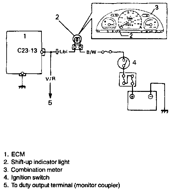 1) Turn ignition switch ON, and shift-up indicator light should light. If not, cause may be burned bulb, open wire, poor connection or faulty ECM. Proceed to "Shift-up indicator light and its circuit inspection".