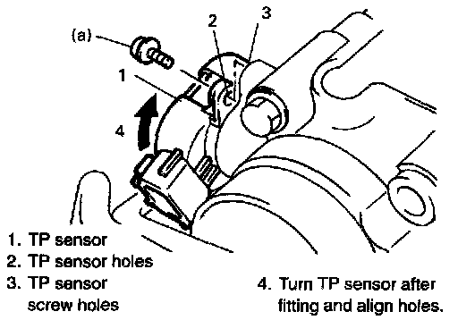 Fit TP sensor to throttle body in such way that its holes are a little away from TP sensor screw holes as shown in left figure and turn TP sensor clockwise so that those holes align.